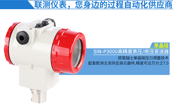 产品简介:SIN-P3000单晶硅压力变送器 0.075%高精度 稳定性简介:SIN-P3000单晶硅压力变送器用于测量液体、气体或蒸汽的液位、密度、压力,然后将其转变成4-20mAHART电流信号输出,也可与HART375或BST Modem相互通信,通过他们进行参数设定、过程控制。与传统压力变送器的区别在于它使用的是纳米单晶硅作为传感器材料。